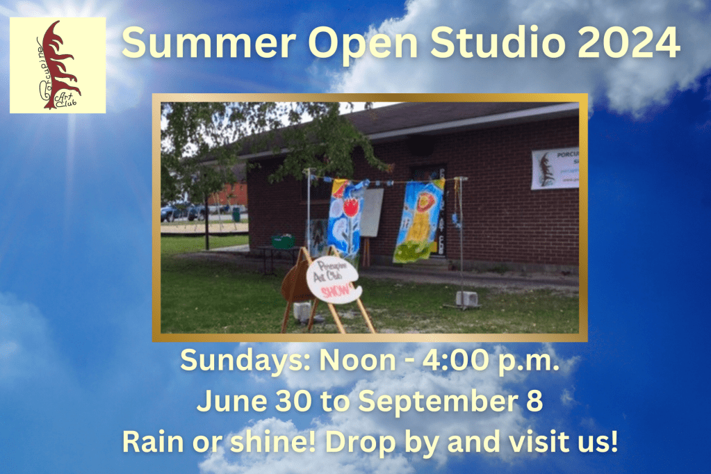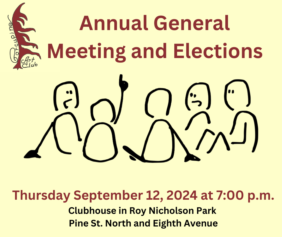 The Porcupine Art Club’s first business meeting of 2024/25 is the Annual General Meeting and biennial election for the PAC Executive. The meeting will be held this Thursday September 12, 204 at 7:00 p.m. at the clubhouse in Roy Nicholson Park (intersection of Pine Street North and Eighth Avenue). New members / potential new members are welcome to attend. The door will be open at 6:40 p.m.