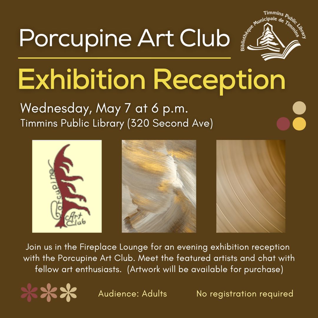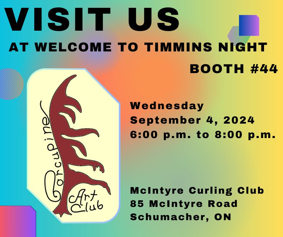 Visit the Porcupine Art Club at Welcome to Timmins Night 2024 on Wednesday September 4, 2024 from 6:00 p.m. to 8:00 p.m. at the McIntyre Curling Club (85 McIntyre Road, Schumacher, ON). We will be at Booth #44! Learn about our club, and many other organizations, clubs, teams, services, and other non-profit groups in the community!