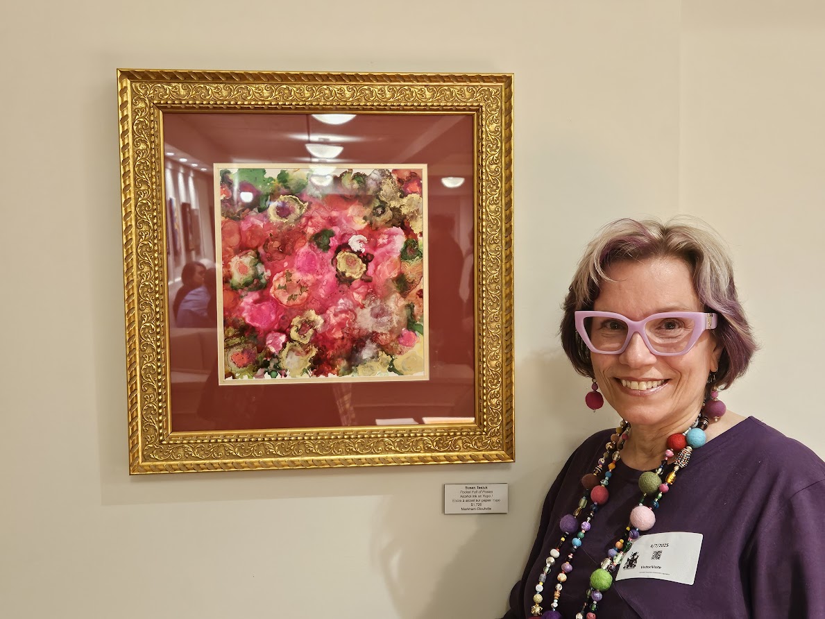 Susan Tesluk and her painting “Pocket Full of Posies” (alcohol ink on Yupo paper).