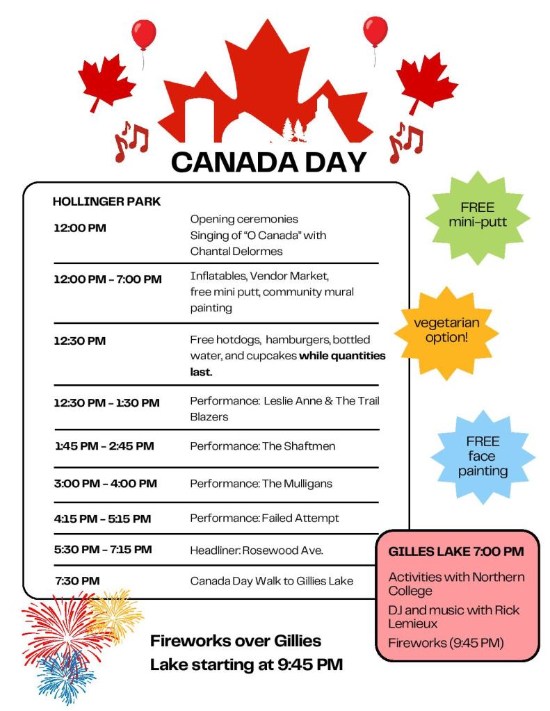 Below is the City’s schedule of festivities. Full details can be found here: https://www.timmins.ca/our_services/culture_and_heritage/canada_day