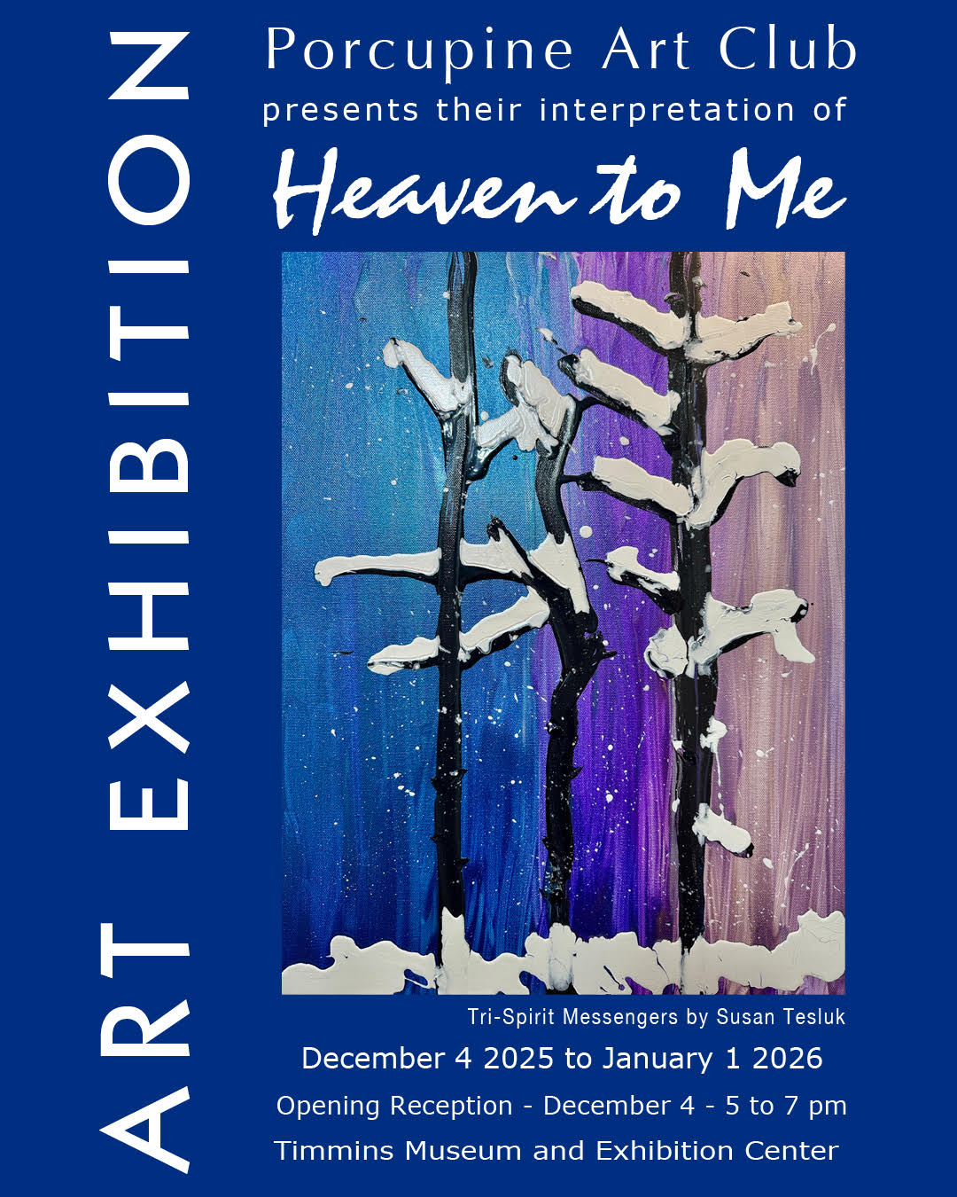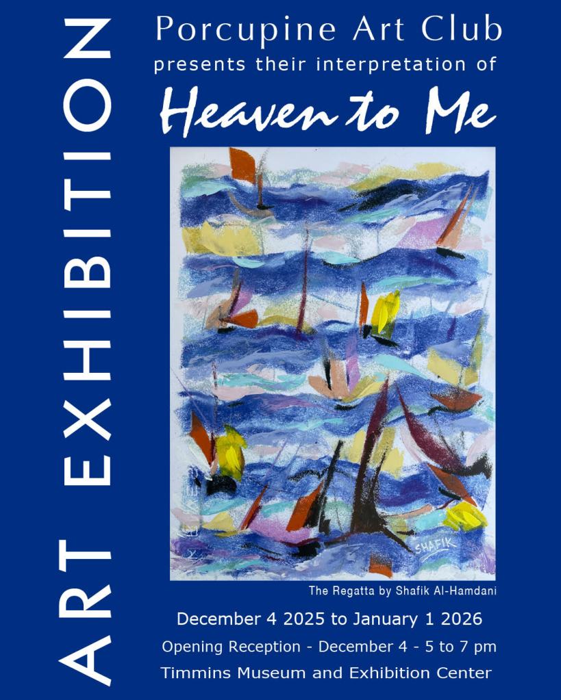 Coming in December, our annual themed show, “Heaven to Me”! The show will be an the Timmins Museum National Exhibition Centre during regular hours until January 2nd. Opening night is Thursday December 4th, 2025 from 5:00 p.m. to 7:00 p.m.