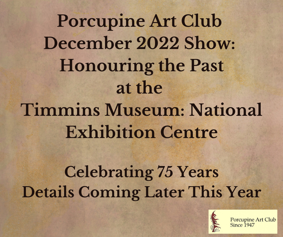 R.E. Bim and Doris Sturgeon founded the Porcupine Art Club on September 26, 1947. This year marks the club’s 75th anniversary. Club members hope to host some related activities in the warmer months. In December of 2022, the Porcupine Art Club will be holding its 75th Anniversary show at the Timmins Museum: National Exhibition Centre. The theme voted on by members is “Honouring the Past”. Keep an eye on our website and our Facebook page to find out more about activities in the near future.