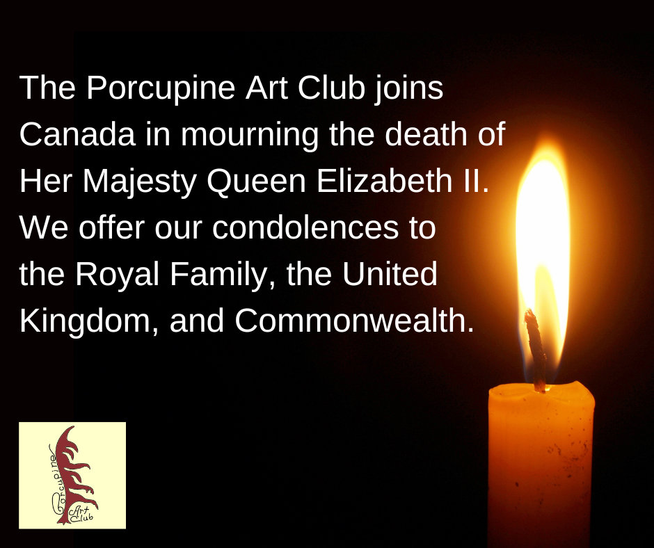 The Porcupine Art Club joins Canada in mourning the death of Her Majesty Queen Elizabeth II. We offer our condolences to the Royal Family, the United Kingdom, and Commonwealth.