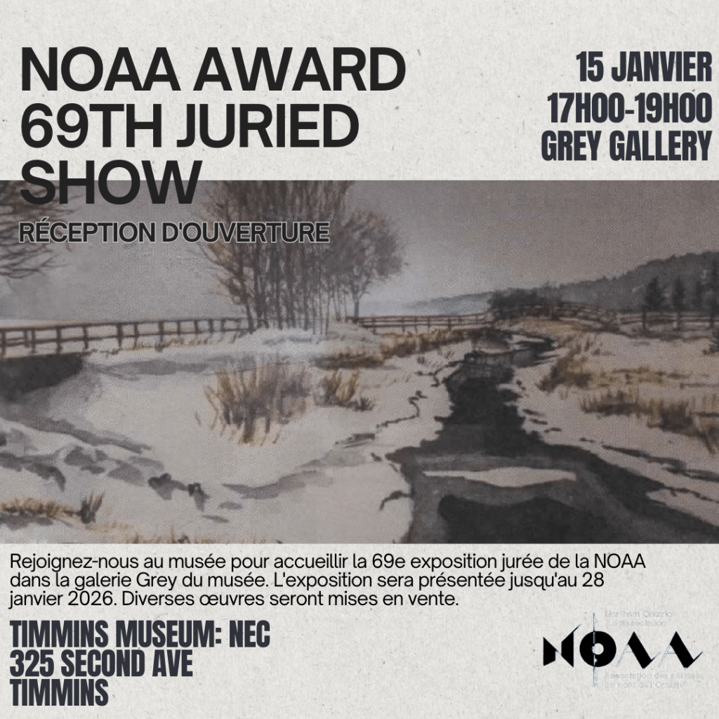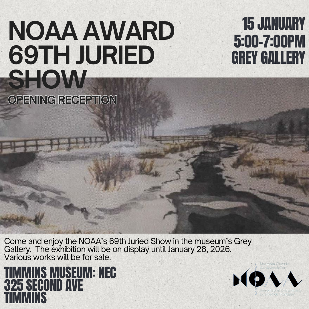 The 69th Annual Northern Ontario Art Association (NOAA) Juried Show is on display at the Timmins Museum: National Exhibition Centre until January 28th, 2026. This exhibit features selected artwork from various members of the NOAA consortium clubs, including some members of the Porcupine Art Club.